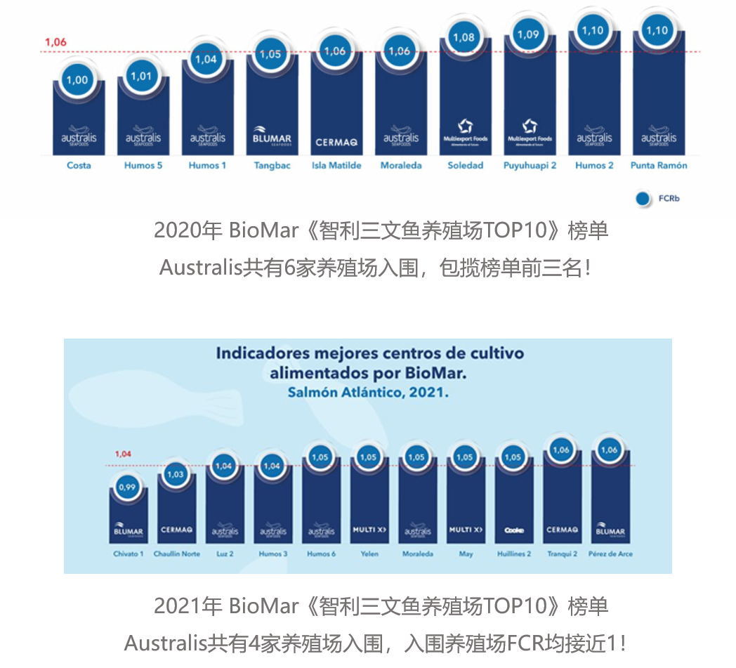 據(jù)全球水產(chǎn)飼料巨頭BioMar發(fā)布的《智利三文魚養(yǎng)殖場(chǎng)TOP10》行業(yè)分析報(bào)告顯示,Australis旗下養(yǎng)殖場(chǎng)已連續(xù)多年持續(xù)健康穩(wěn)定運(yùn)營(yíng),關(guān)鍵養(yǎng)殖指標(biāo)表現(xiàn)優(yōu)異,領(lǐng)跑全行業(yè)。