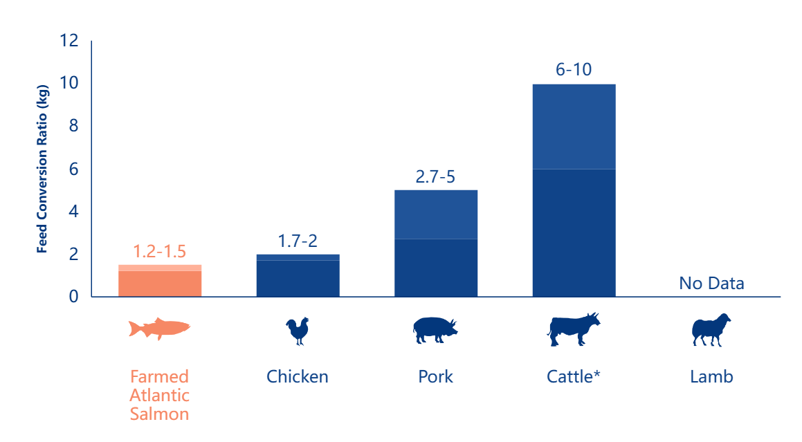 與其他常見畜牧類相比,三文魚的飼料轉化率 (FCR) 均表現優良,業內平均在1.2-1.5之間,即投入1.2-1.5kg 飼料,魚兒就能生長1kg,所以說三文魚是一種高效能動物蛋白。佳沃食品智利子公司Australis在養殖過程中,表現最好的養殖場飼料轉化率 (FCR) 指數更是達到了驚人的0.99,成為業內關注的焦點。