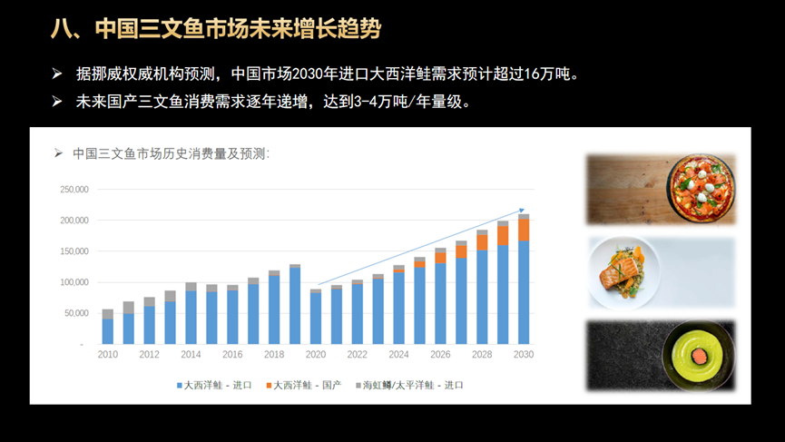 演講中,梁欽垚與與會行業伙伴分享了來自國際權威行業研究前沿的專業數據。他提到,疫情后時代,中國市場家庭烹飪場景中的三文魚消費占比增長明顯;三文魚作為一種高營養健康食材,正逐漸深入普通家庭的日常消費。隨著中國三文魚價格的理性回歸,未來三文魚消費需求將逐年遞增,無論國產三文魚還是進口三文魚,都將迎來新的發展機遇。