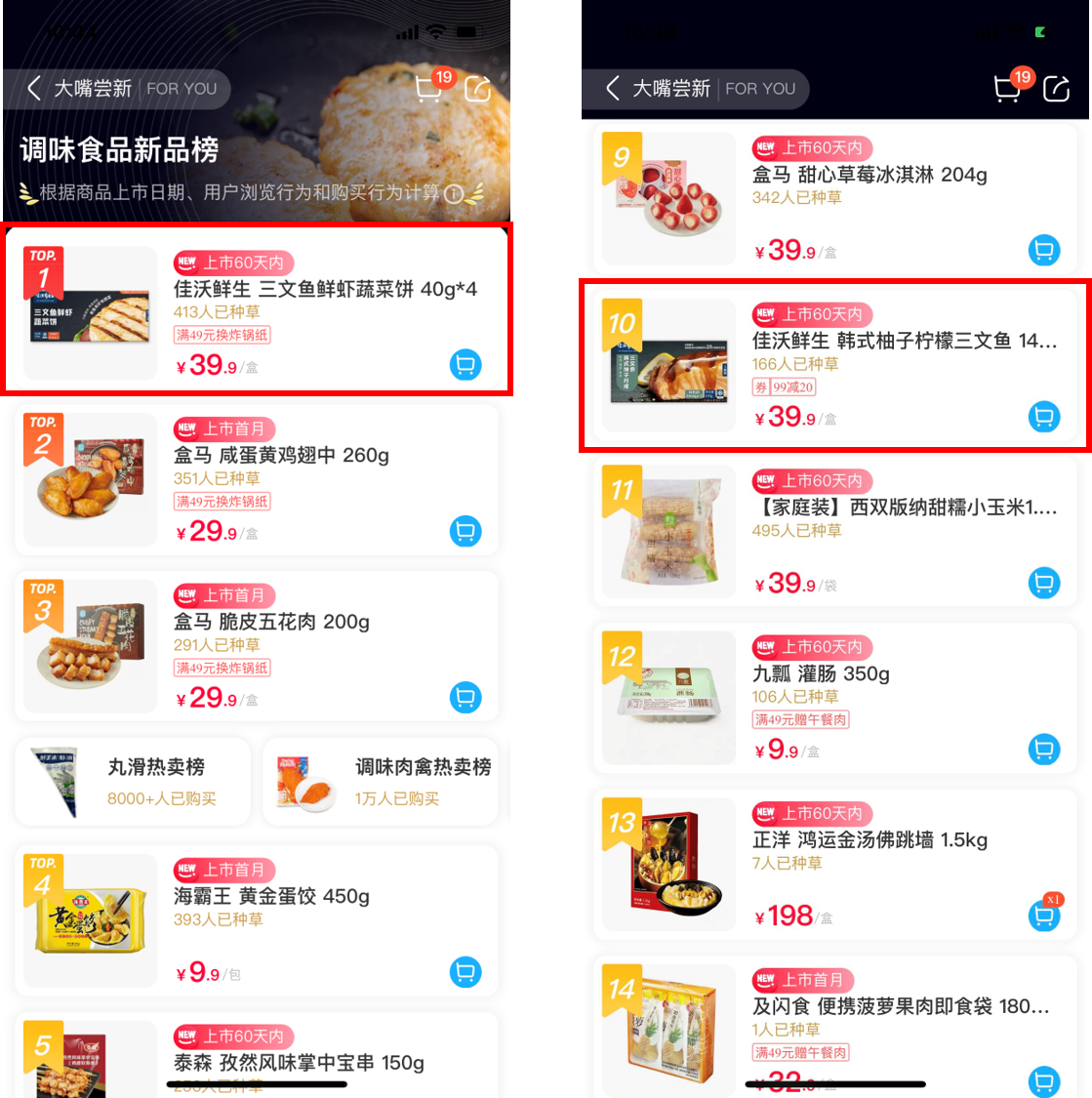 7月剛剛面市的佳沃鮮生“韓式柚子檸檬三文魚”和“三文魚鮮蝦蔬菜餅”兩款三文魚預制菜品在開售首月便取得了亮眼的銷售表現。上市僅一個月,“三文魚鮮蝦蔬菜餅”便已斬獲盒馬鮮生調味食品新品榜的冠軍,而“韓式柚子檸檬三文魚”的銷售表現也始終穩定在榜單前十名中!